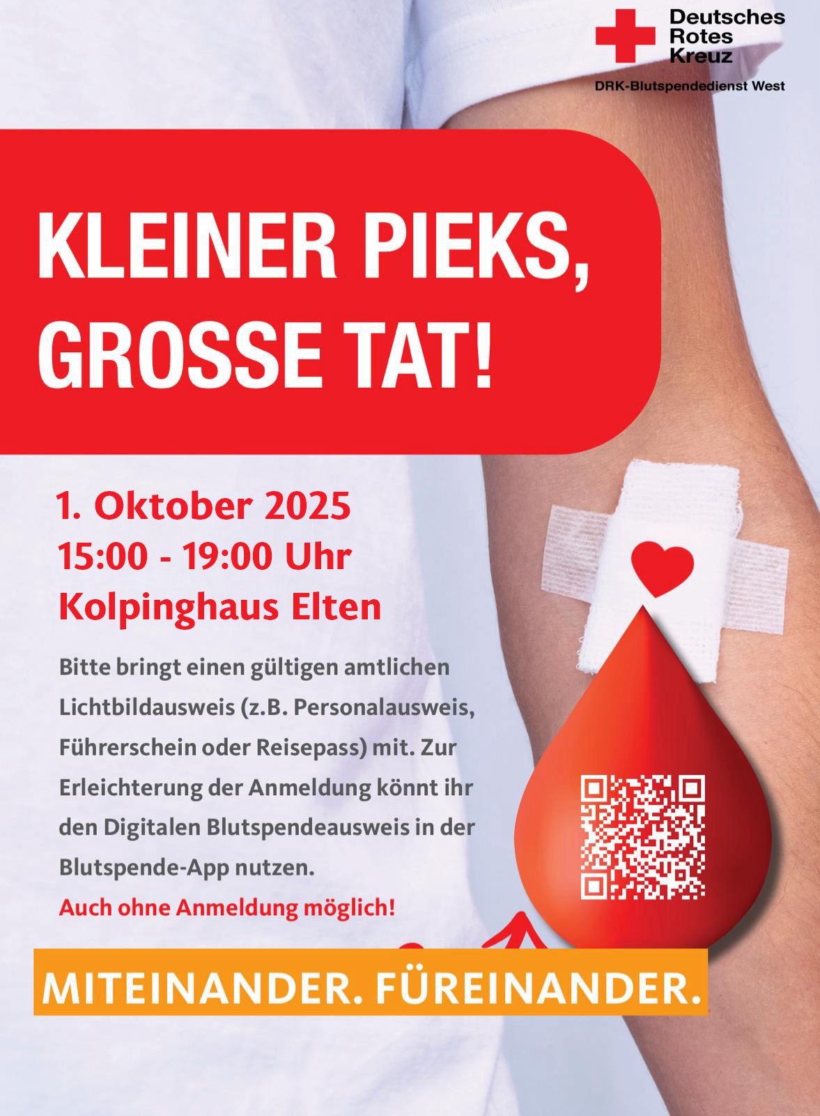 Am 01. Oktober 2025 findet in der Zeit von 15:00 bis 19:00 Uhr erneut in Blutspendetermin in Elten statt....